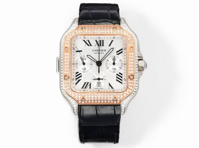 卡地亚山度士计时码表镶钻定制版闪耀来袭 ①机芯:采用丹东7550机芯,品质稳定可靠; ②表壳:拥有43.3毫米的腕表直径,采用最先进Cnc镶嵌表,此工艺可与媲美手工镶嵌; ③表盘:采用了分区设计,中央的方形区域采用了拉丝工艺,三个功能盘装饰有蜗形纹,两者形成了鲜明的对比;经典的罗马数字时标和剑形指针相得益彰,6点钟位置设有日期显示窗口,经典典雅的造型设计给人留下了深刻的印象,创新设计又为腕表增添了活力,底纹细腻,颜色对版; ④玻璃:防水防刮蓝宝石玻璃; ⑤表带:采用意大利牛皮,提高佩戴舒适度; 一款拥有高