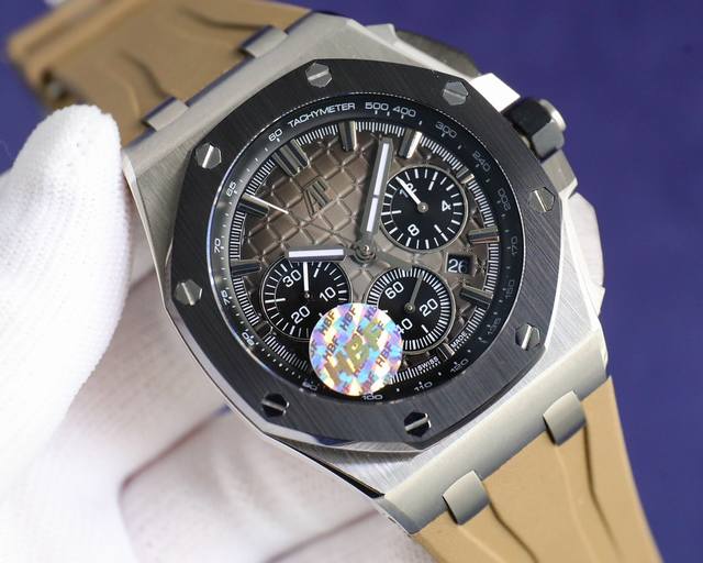 Hbf 最新款爱彼,陶瓷圈口版本爱彼audemars Piguet 皇家橡树离岸型限量多功能计时机械腕表 尺寸44Mm17Mm 圈口 圈口是与原装一致采用进口陶瓷圈口 把头 表冠采用六边形陶瓷材质,顶端采用拉丝打磨技术 机芯 表芯在透底后盖的衬托下更为霸气侧漏,灰黑色的全自动陀很有层次感,再加上表芯表面的镶嵌宝石。7750改 Calibre4401 全自动计时机械机芯 表镜 表镜选用进口蓝宝石玻璃镜面 表壳 采用进口316精钢鑫表壳 表带 搭配进口氟橡胶表带 原装针扣 硬汉必备神器 经过