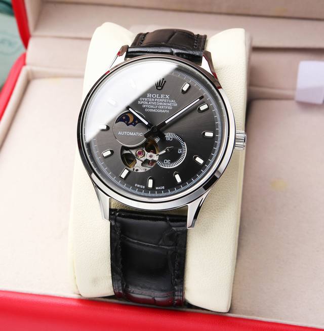 劳力士,日月星辰系列,搭载原装进口82S7机芯 0返修0售后 ,采用超a精钢壳套 做工精细,防水程度可达5度。可游泳 字面采用进口优质铜材 做工细致无瑕疵,在自然光下很有层次感,光彩夺目。 9位个性24小时/真月相显示,镂空设计,机芯运作一览无余,5位小秒。双卜蓝宝石玻璃镜面,超强夜光效果,意大利牛皮,表径40X11M。5度防水!