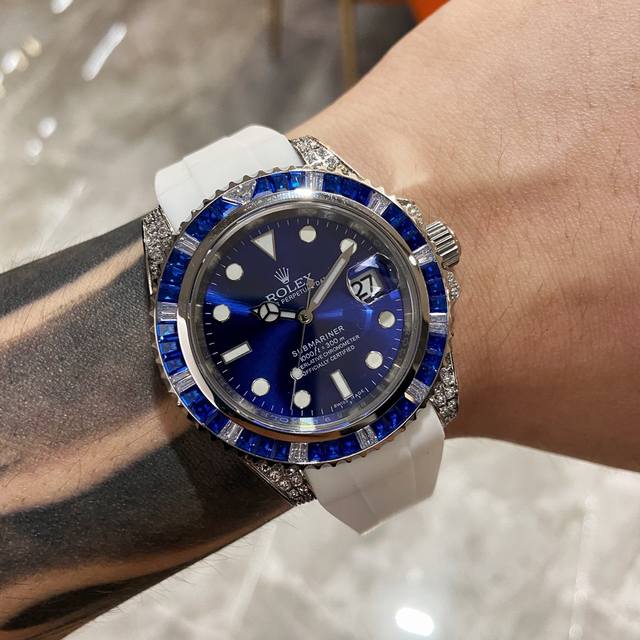 劳力士-Rolex宝石圈定制级改版水鬼来袭携手高端珠宝工厂,重金镶嵌72颗黑、绿、蓝宝石相应色水鬼圈口,搭配表壳耳杆处钻石,犹如光茫四射,吸睛神器 机芯 仍然搭载全新全自动机械机芯,走时精准,性能优异,动力储备高达24小时 表壳 316L精钢表壳镶嵌黑、绿、蓝水鬼相应同色宝石,壳身耳杆、把头保险栓处搭配施华洛世奇水晶钻,奢华至极,个性张扬,经典表款不再撞表防刮蓝宝石玻璃镜面,蓝光放大镜日历窗,精致的做工完美秉承原装的潜水性能 字面 刻度清晰,冰蓝色夜光超强持久,细节同步正品 表带 此次改装同